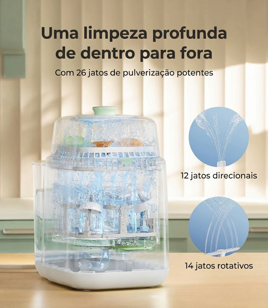 Máquina de lavar biberões automática com tecnologia avançada, ideal para limpar biberões, peças de bomba e outros acessórios de forma rápida e eficiente.